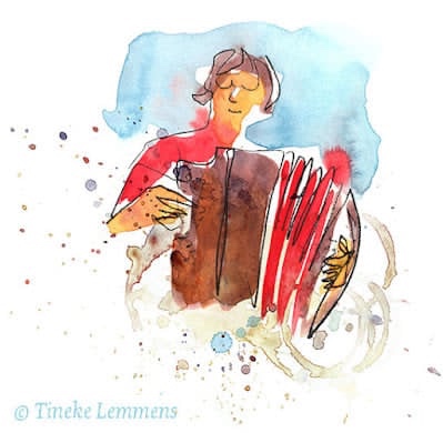 Tineke Lemmens kennen jullie mogelijk van de tekeningen in het Diatonisch Nieuwsblad. Speciaal voor het trekzakspelend publiek maakte ze nu een reeks collages van harmonicamannetjes. Hiervoor hergebruikte ze oude bladmuziek, in combinatie met afdrukken van allerlei materialen (waaronder een afgedankte Castagnari-grill; leuk om te weten voor de insiders).