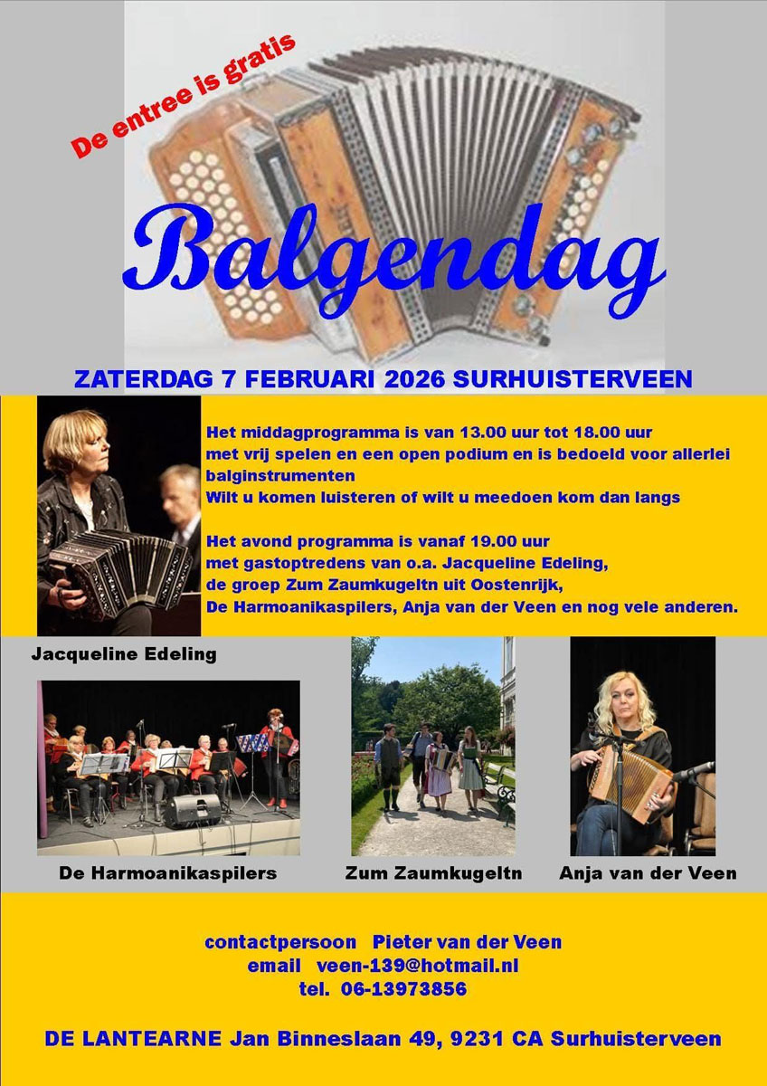 Wij houden ons dus aanbevolen voor alle berichten over trekharmonika-evenementen, of evenementen, waarin de trekharmonika nadrukkelijk aanwezig is (en dat is nogal gauw het geval als de trekharmonika ergens aanwezig is...).