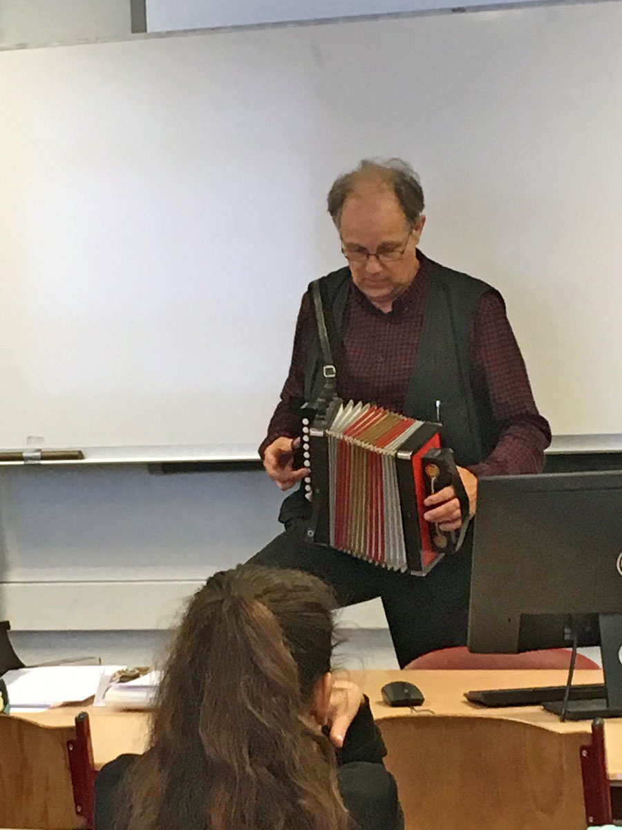 Een nobele geste van Jorina van Bergen, muziekdocente aan Haagse Christelijk College ‘De Populier’, dat slechts een paar huizen van mijn kantoortje verwijderd ligt: ik krijg de kans om in de les meer te vertellen over de trekharmonica aan de hand van lichtbeelden en kan ook een paar nummers spelen.