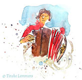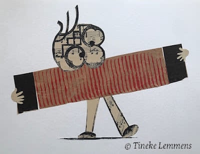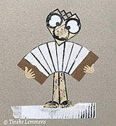 Tineke Lemmens kennen jullie mogelijk van de tekeningen in het Diatonisch Nieuwsblad. Speciaal voor het trekzakspelend publiek maakte ze nu een reeks collages van harmonicamannetjes. Hiervoor hergebruikte ze oude bladmuziek, in combinatie met afdrukken van allerlei materialen (waaronder een afgedankte Castagnari-grill; leuk om te weten voor de insiders).
